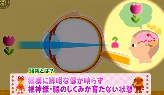 弱視になると、ものを近づけても離してもピントが合わず、はっきりと見ることができません。「近視」の場合はメガネをかければ見えるようになりますが、「弱視」の場合は、ものを見る脳の機能そのものが育っていないため、メガネをかけても見えないのです。