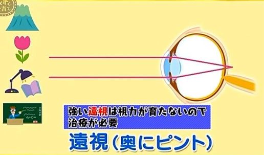 「遠視」とは、網膜の後ろ側にピントがきてしまう状態です。「強い遠視」は、脳にぼやけた映像しか伝わらないため、視力が育ちません。この場合、治療が必要になります。