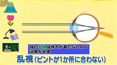 「乱視」とは、眼球のひずみで縦方向と横方向のピントが1か所に合わないため、網膜の中心に正しい映像が映らない状態です。「強い乱視」は、脳に鮮明な映像が伝わらず、視力が育ちません。この場合、治療が必要になります。